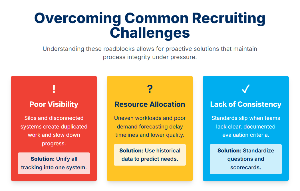 Even a well-structured process can still face challenges that stall recruiting. Understanding these roadblocks allows for proactive solutions that maintain process integrity under pressure.