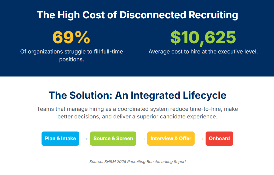 According to SHRM’s 2025 recruiting benchmarking report, 69% of organizations struggle to fill full-time positions, and the cost to hire at the executive level reaches $10,625. These issues worsen when recruiting is broken into disconnected tasks instead of a unified system.