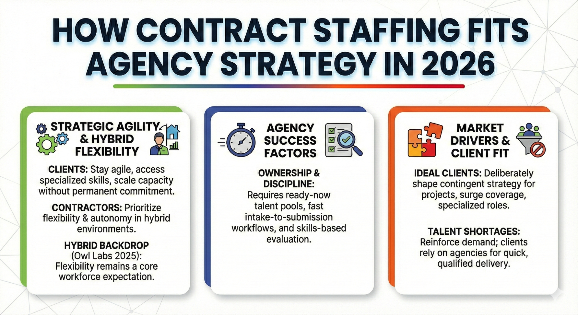 Contract staffing is a strategic staffing model in 2026. Clients use it to stay agile, access specialized skills, and scale capacity up or down without permanent hiring commitments. Contractors choose it because flexibility and autonomy shape how they evaluate work, especially in hybrid environments.