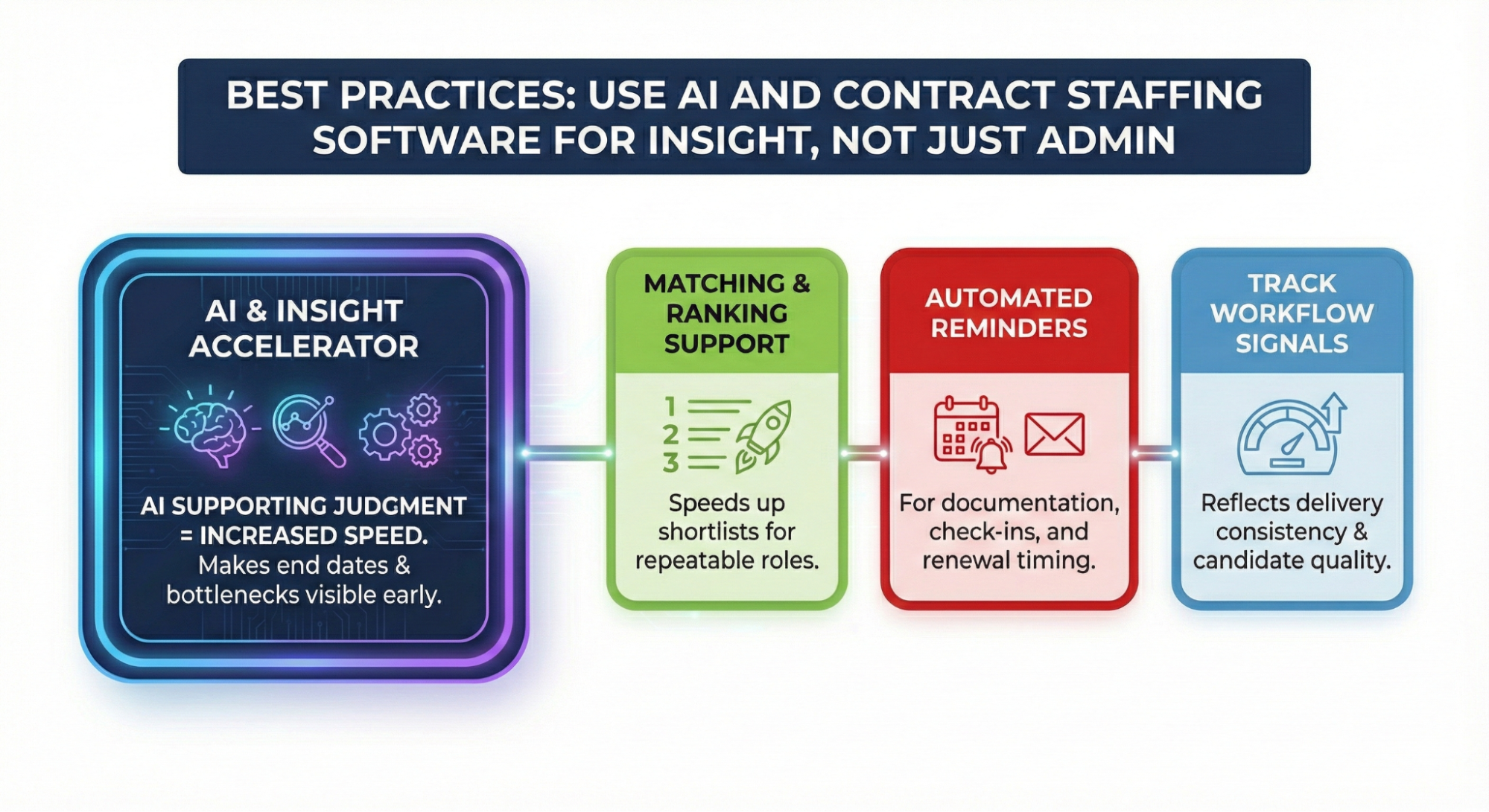 AI and automation increase speed when they support recruiter judgment, not replace it. The right contract staffing software also makes end dates, redeployment readiness, and workflow bottlenecks visible early, so teams protect revenue before gaps show up.
