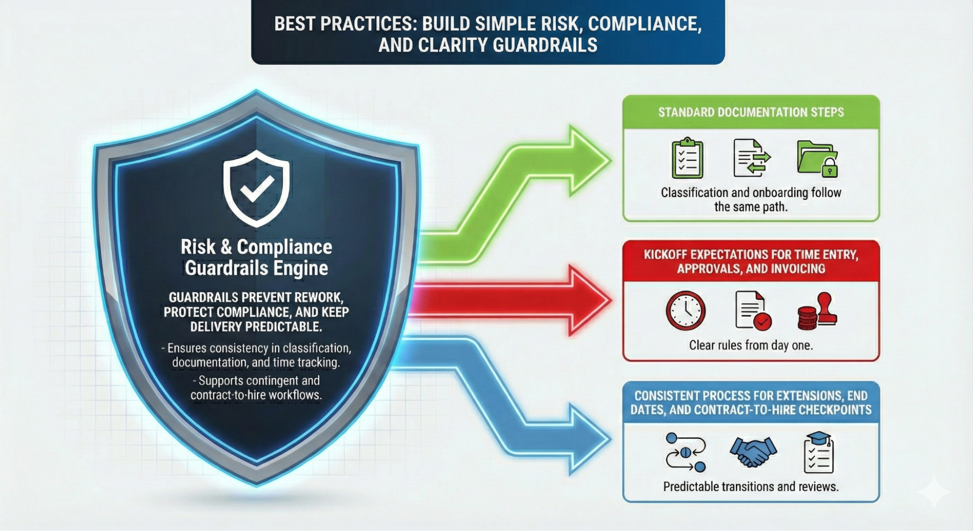 Contract staffing breaks down when classification, documentation, and time tracking vary by recruiter or account. Guardrails prevent rework, protect compliance consistency, and keep delivery predictable across contingent staffing services and contract-to-hire workflows.