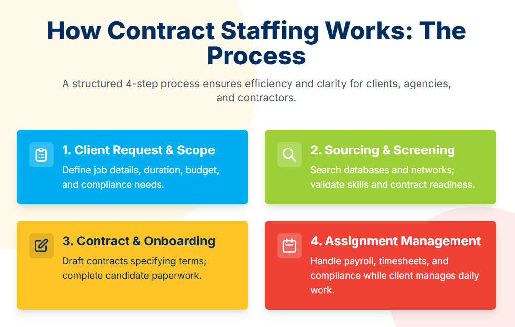 Contract staffing services follow a structured process that separates them from traditional temp agencies through longer engagement periods and specialized focus. Here’s how it actually plays out: