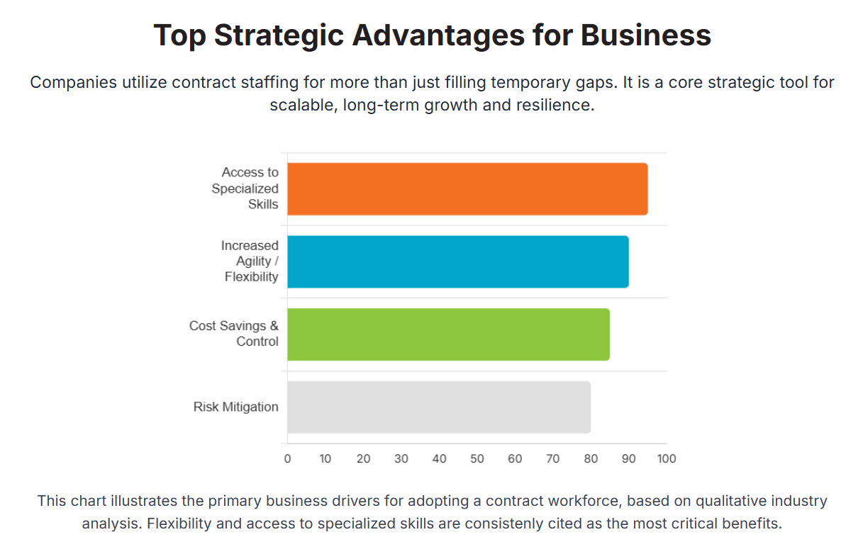 It allows companies to respond to demand fluctuations or skill shortages quickly without adjusting permanent workforce size. Organizations can scale teams up or down based on project cycles and market demands.