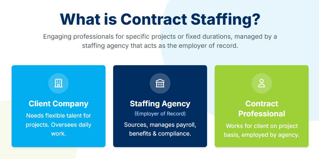 Contract staffing is a hiring model where companies engage professionals for specific projects or fixed durations rather than permanent positions. A contract staffing agency typically sources these professionals, manages payroll and benefits, and handles compliance while the client oversees daily work.
