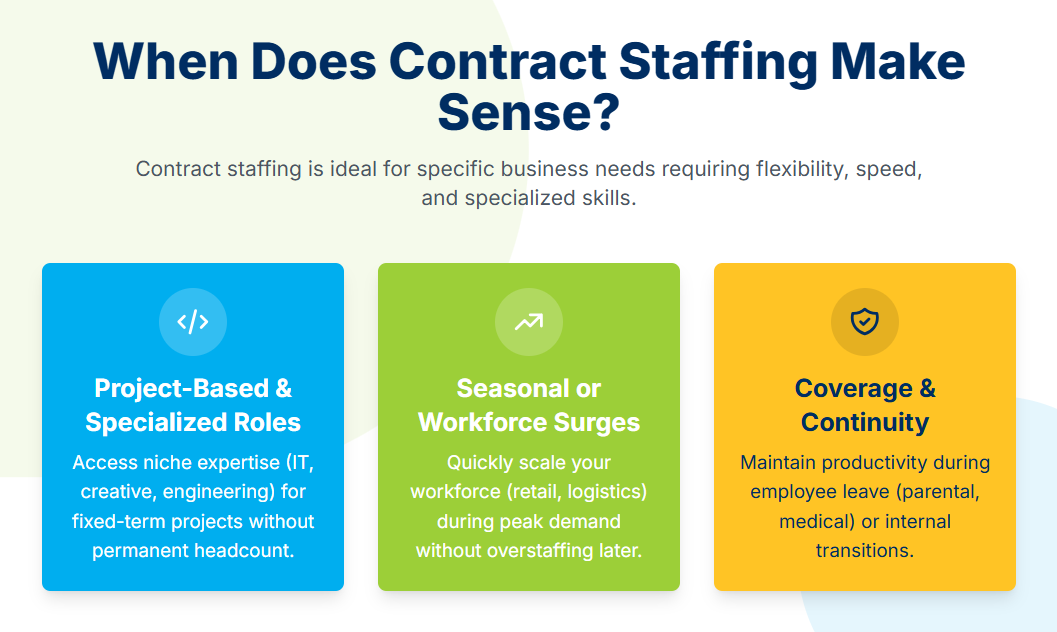 Contract staffing makes sense when clients need rapid workforce adjustments or short-term specialists. Staffing agencies recommend it when projects have fixed timelines, workloads fluctuate, or permanent hiring would add unnecessary costs. For agencies, it means predictable monthly revenue and stronger client relationships.